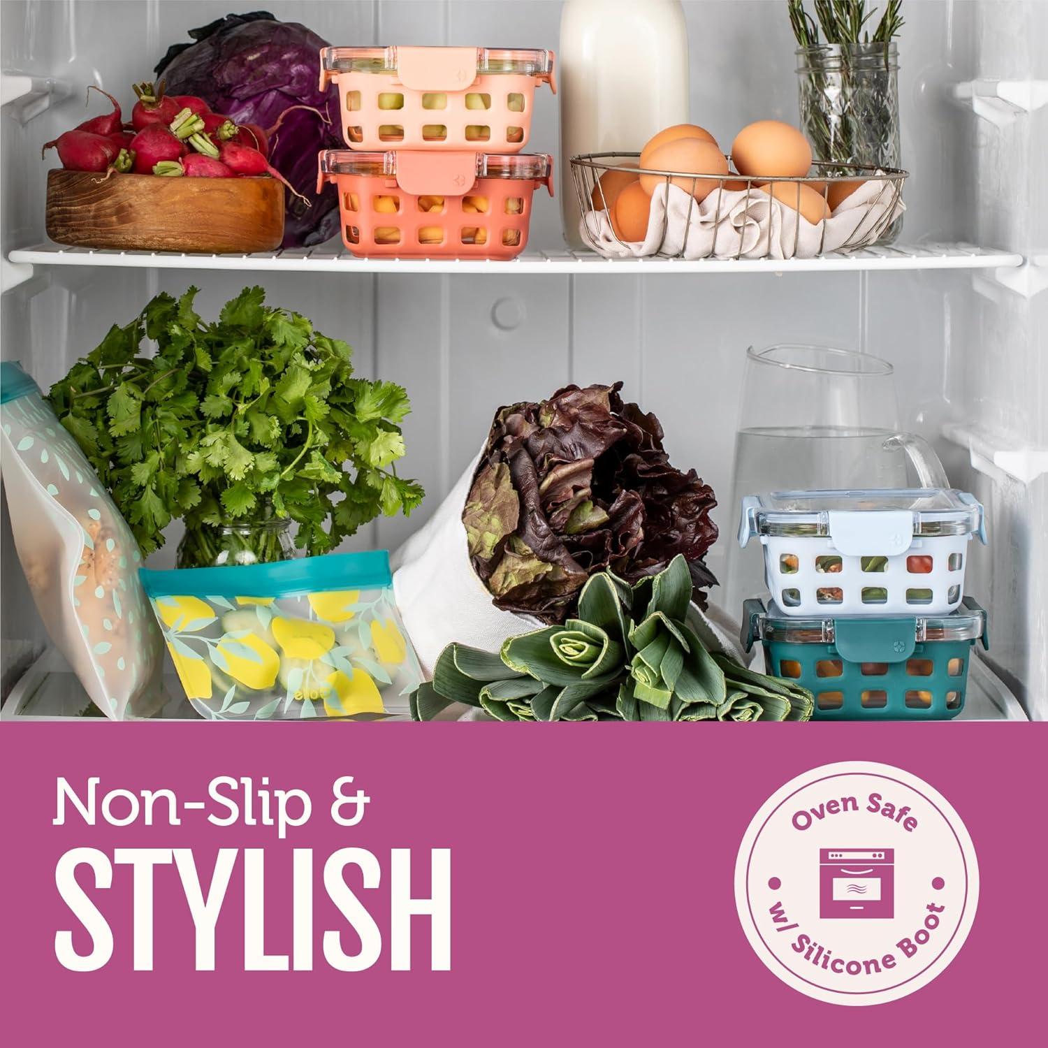 Make meal prep fun! The Ello DuraGlass 10-piece Meal Prep Set includes (5) 3.4 cup glass containers each with leak-proof lids and extra thick silicone protection boot to protect from chips and breaks. Clear, BPA-Free plastic lids let you see contents inside and include air tight snaps that won't leak and keep food fresher longer. Containers are dishwasher safe, and microwave and oven safe without the lid and no need to remove the silicone sleeve! Duraglass is non-porous, so it won't absorb food odors, flavors, or stains. Do not place hot containers on wet or cold surfaces.