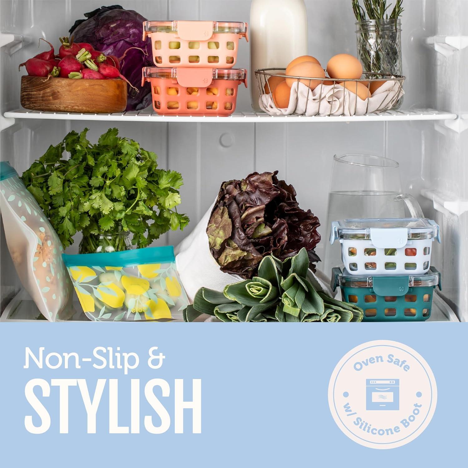 Make meal prep fun! The Ello DuraGlass 10-piece Meal Prep Set includes (5) 3.4 cup glass containers each with leak-proof lids and extra thick silicone protection boot to protect from chips and breaks. Clear, BPA-Free plastic lids let you see contents inside and include air tight snaps that won't leak and keep food fresher longer. Containers are dishwasher safe, and microwave and oven safe without the lid and no need to remove the silicone sleeve! Duraglass is non-porous, so it won't absorb food odors, flavors, or stains. Do not place hot containers on wet or cold surfaces.