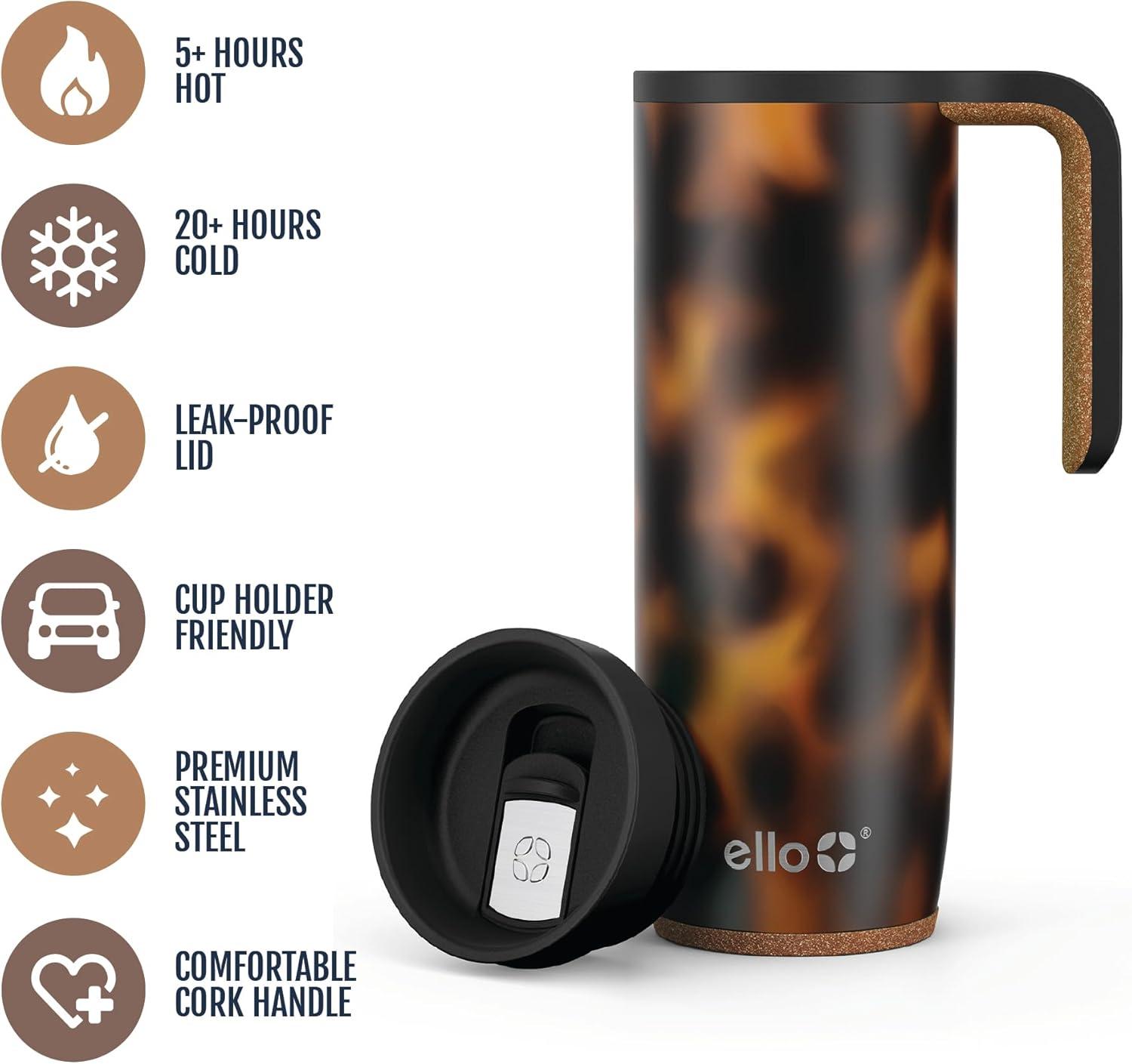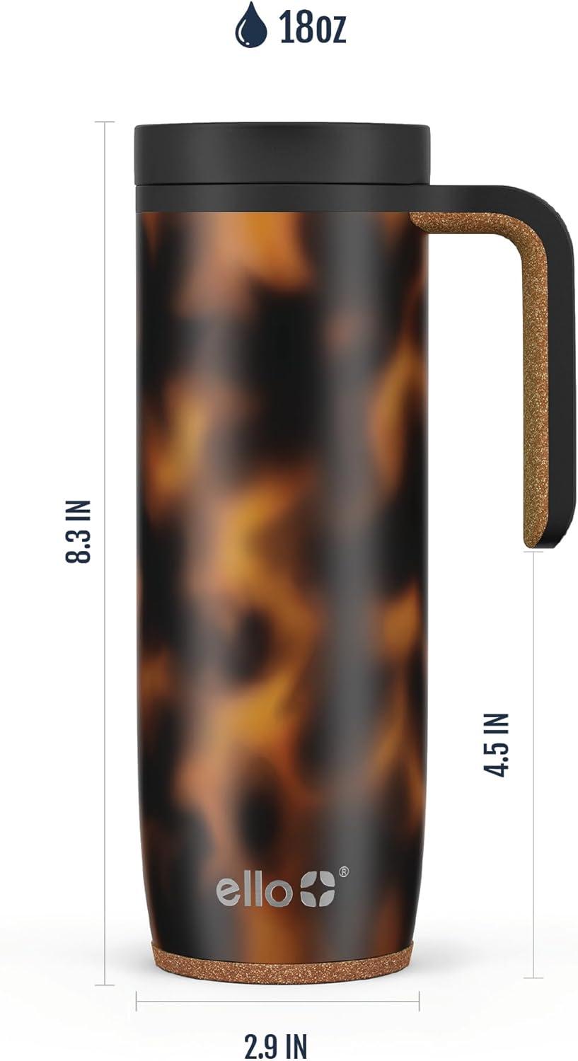 Ello Magnet 18oz Vacuum Insulated Stainless Steel Travel Mug with Side Handle and Leak-Proof Slider Lid and Built-in Coaster, Keeps Hot for 5 Hours(Tortoise Shell Airwap)