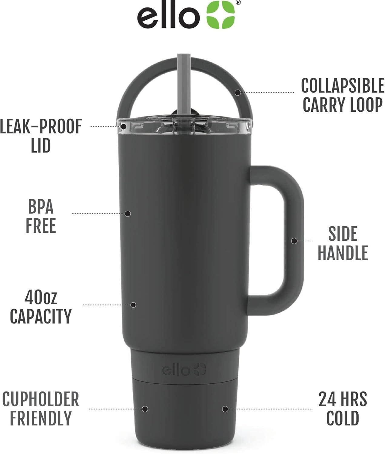 Ello Port 40oz Tumbler with Carry Loop & Integrated Handle, Vacuum Insulated Stainless Steel Reusable Water Bottle, Travel Mug with Leak Proof Lid & Straw, Perfect for Iced Coffee & Tea, Sage(Black)